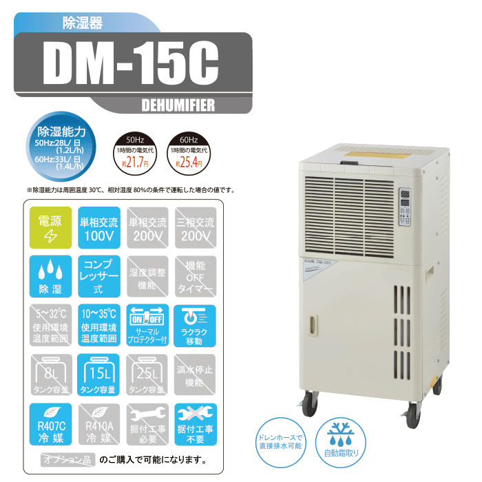 デジカント式に比べ電気代が抑えられる他、梅雨、夏場などの高温多湿な環境ほど高い除湿能力を発揮します。